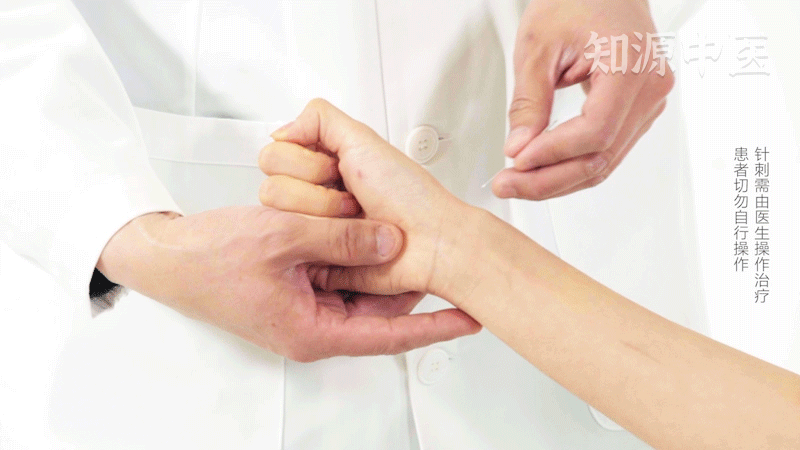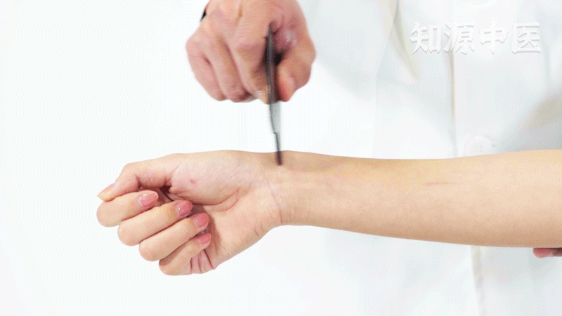 2.【其他常用取穴法】:仰掌,在腕之拇侧横纹头,按其凹陷中有脉博动处之外侧是穴位,下针时应避开血管。