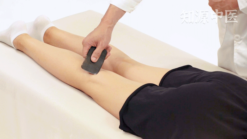 用刮痧板与皮肤呈45°对委中穴进行刮擦,以局部皮肤潮红为度,每次刮痧约3-5分钟,可以辅助治疗腰腿痛,下肢的疼痛。