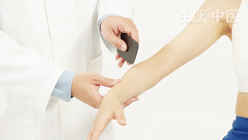 用刮痧板的1/3边缘接触皮肤,从上向下刮拭下廉穴,力度稍重,以出痧为度,可调理肠腑、通经活络。