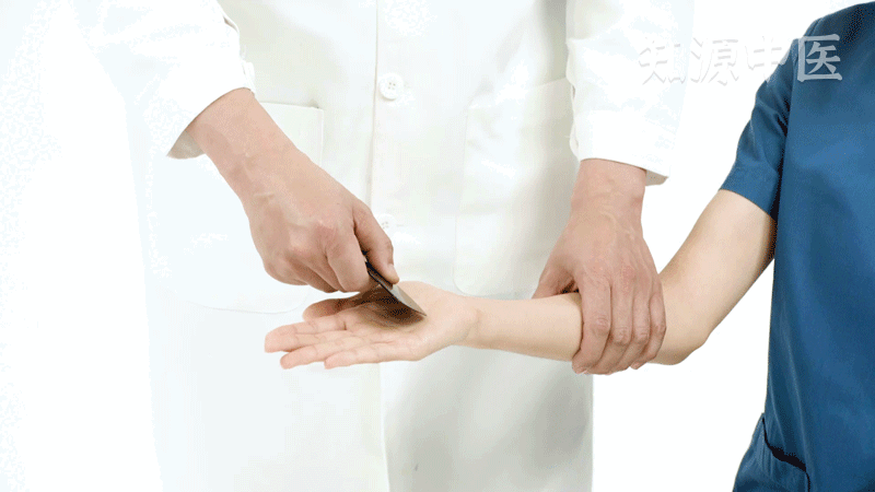 用刮痧板与皮肤呈45°,自掌根到指尖进行单向的刮擦,每次30-50下,可以缓解心烦、胸闷等证。