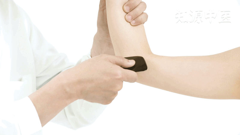 用刮痧板与皮肤呈45°自上而下单向刮擦少海穴,每次3-5分钟,隔天一次,可以缓解肘臂的挛痛、手麻等证。
