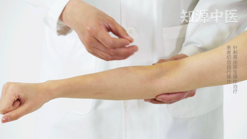 2.【其他常用取穴法】:手臂平伸,手掌向上,前臂略向上使肘稍屈,从肘窝横纹之外侧,试以大指按穴处,前臂稍屈时即有大筋凸起,筋外侧有大静脉一条,在静脉外侧凹陷处是穴。