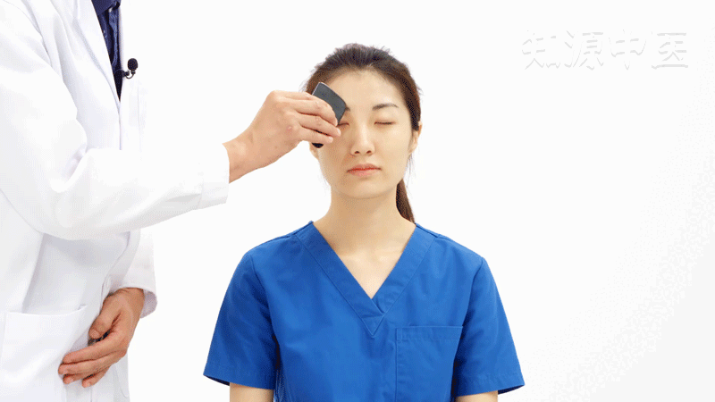 用刮痧板从攒竹穴向眉梢方向进行单向刮痧,刮擦10-15次,可以改善头痛、眼疾等。