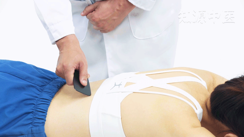 用刮痧板对脾俞穴自上而下进行刮擦,以潮红为度,可以隔天一次,每次约3-5分钟,可以辅助治疗腹胀、便血。