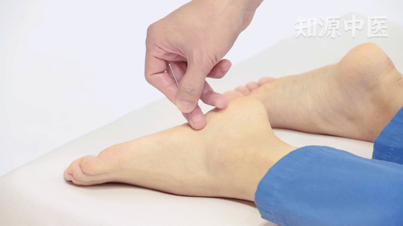 3.【其他常用取穴法】:正坐垂足,在申脉穴之前下方五分。当弯形骨外侧凹陷处,按之极痠是穴。