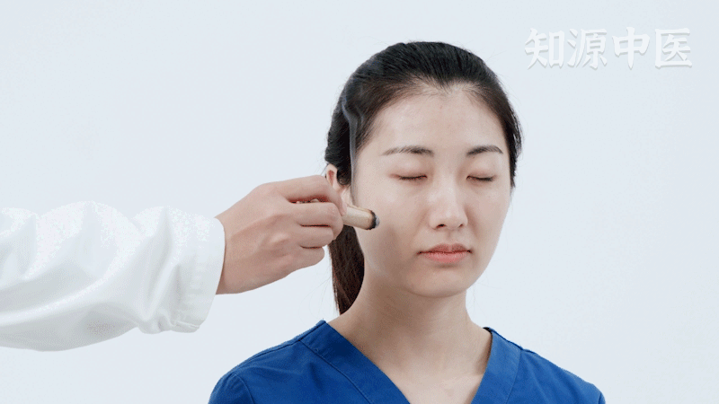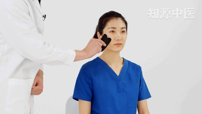 找到颧髎穴,用刮痧板与皮肤呈四十五度,使用角刮法,对颧髎穴由内向外进行单向地刮擦,每次3分钟左右,力度要轻,可以治疗嘴歪。