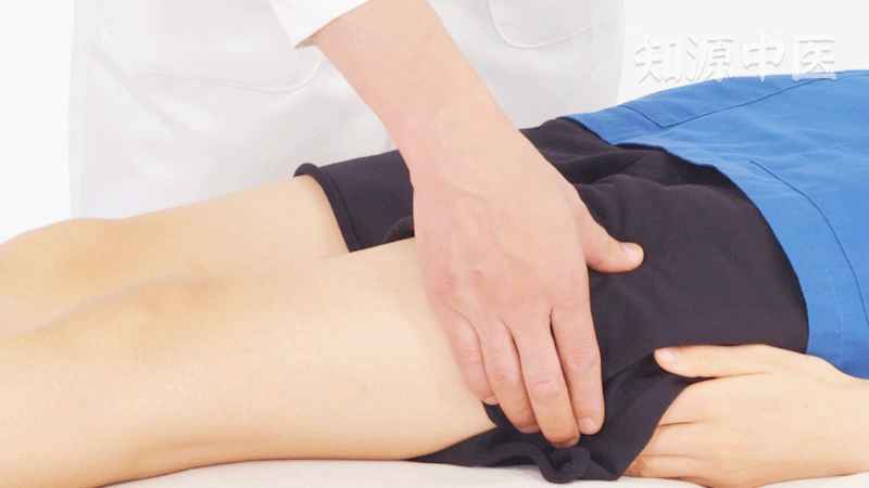 3.【其他常用取穴法】:一般取法:患者正坐屈膝,术者以右手掌后之横纹,对应患者之左膝盖按覆之,中指尖着处即是伏兔穴(可参考伏兔取法),再以掌后横纹对准伏兔穴按覆之,中指尖着处,稍偏里,两大筋间凹陷是穴。
