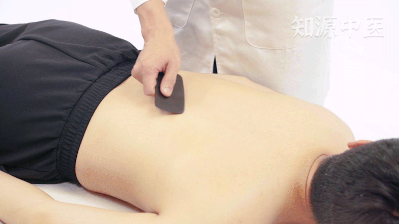 用刮痧板与皮肤呈45°角对魂门穴进行单向的刮擦,以局部皮肤潮红为度,每次3-5分钟,可以辅助治疗胸肋的疼痛、背痛。