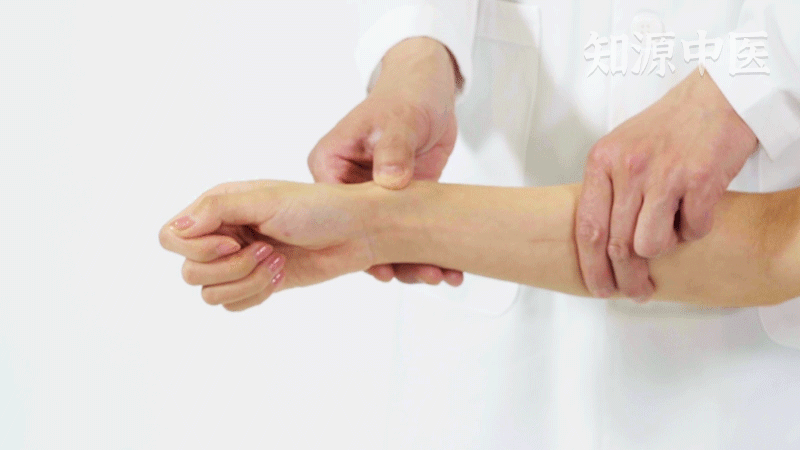 - 第2步:一手食指压在另一手的桡骨茎突(掌心向前,手腕外侧突起的骨头)上;